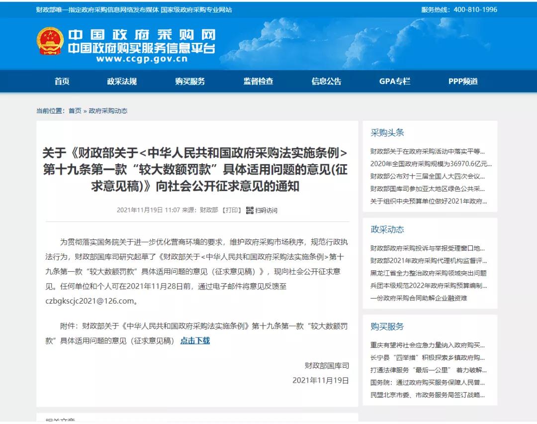 為貫徹落實國務院關于進一步優(yōu)化營商環(huán)境的要求,維護政府采購市場秩序,規(guī)范行政執(zhí)法行為,財政部國庫司研究起草了《財政部關于<中華人民共和國政府采購法實施條例>第十九條第一款“較大數(shù)額罰款”具體適用問題的意見(征求意見稿)》,現(xiàn)向社會公開征求意見。任何單位和個人可在2021年11月28日前,通過電子郵件將意見反饋至czbgkscjc2021@126.com。