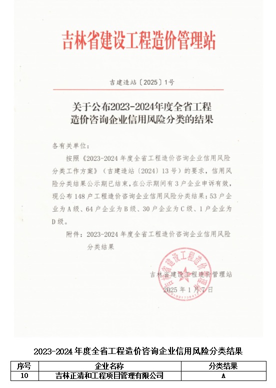 2023-2024年度全省工程造價咨詢企業(yè)信用風(fēng)險分類A級 2023-2024年度全省工程造價咨詢企業(yè)信用風(fēng)險分類A級 上一篇:第一屆優(yōu)秀工程造價成果獎(二等獎) 下一篇:2022-2023年度吉林省建設(shè)工程造價咨詢企業(yè)信用風(fēng)險分類A級